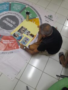 A atividade incluiu uma dinâmica com recortes e colagens a partir de revistas, permitindo que cada participante representasse simbolicamente sua vivência com o HIV/AIDS. Os cartazes produzidos traduziram sentimentos, desafios e conquistas, fortalecendo o senso de pertencimento e ampliando o diálogo para além das palavras.